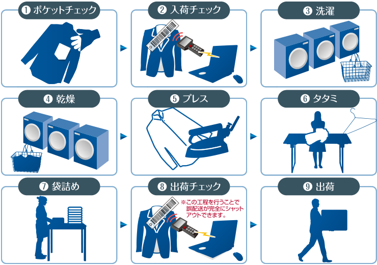 日本全国に、ユニフォーム使用後の専属クリーニング施設にて、ユニフォームの管理、メンテナンス、クリーニングなどのアフターサービスを行っております。